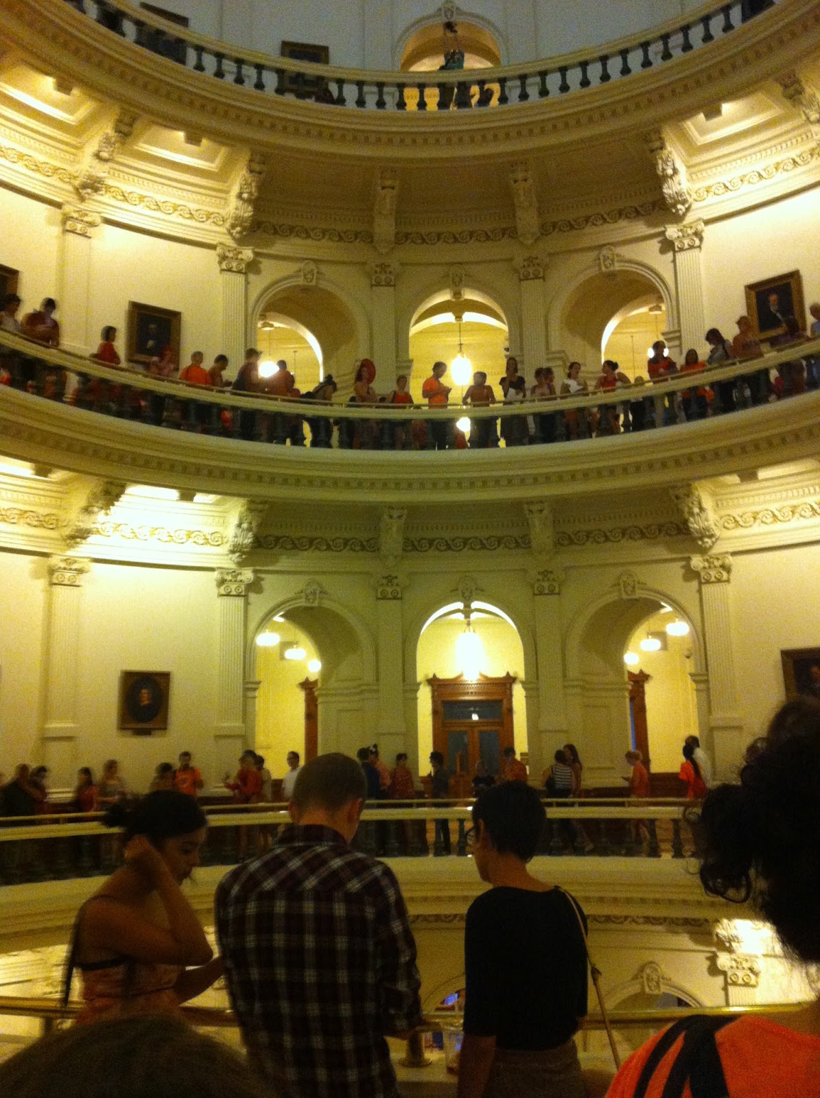 But then . . . Sunday night during testimony on the bill in front of the Texas House, something amazing happened. Individuals gathered to stage a citizens' filibuster. Testimony from people opposing the law went on for hours and hours. Folks camped out in the hallways of the Capitol through the night. Supporters from around the country started having food delivered to the people waiting to give their testimony.
