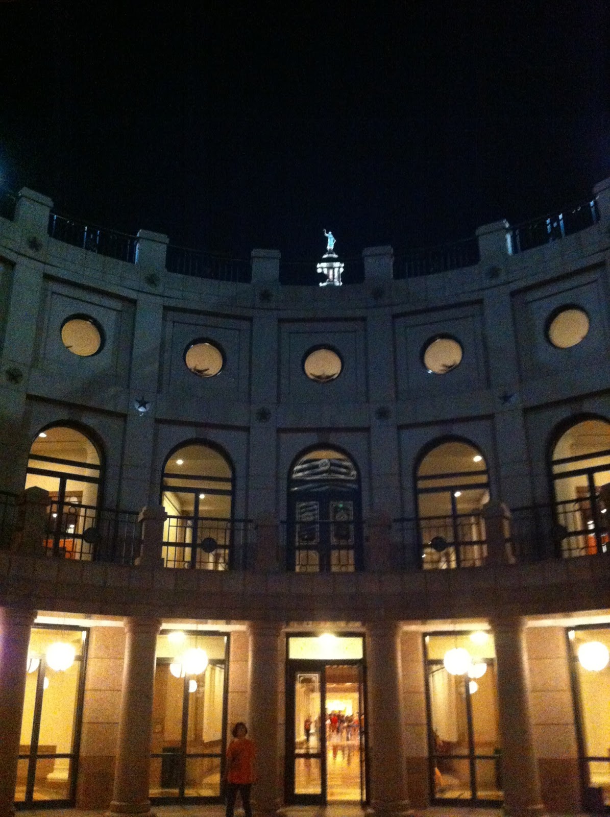 We sat on the floor of one auditorium for a while, only to have nothing happen. The president of the Senate, David Dewhurst, had called a point of order, and the legislators were debating the rules of a filibuster away from the microphones. Senator Davis was still not allowed to sit or lean or eat or drink while the debate was ongoing.
